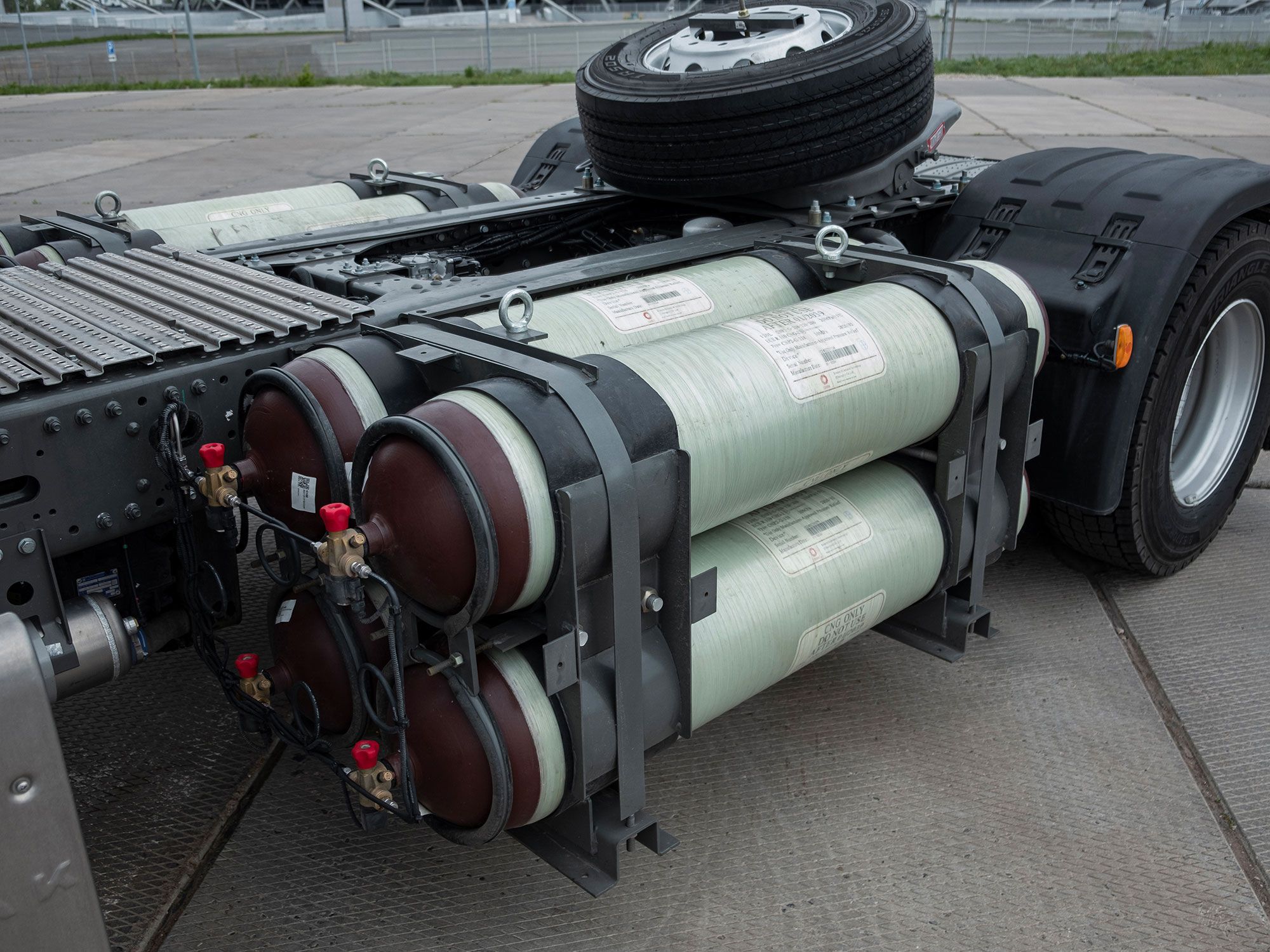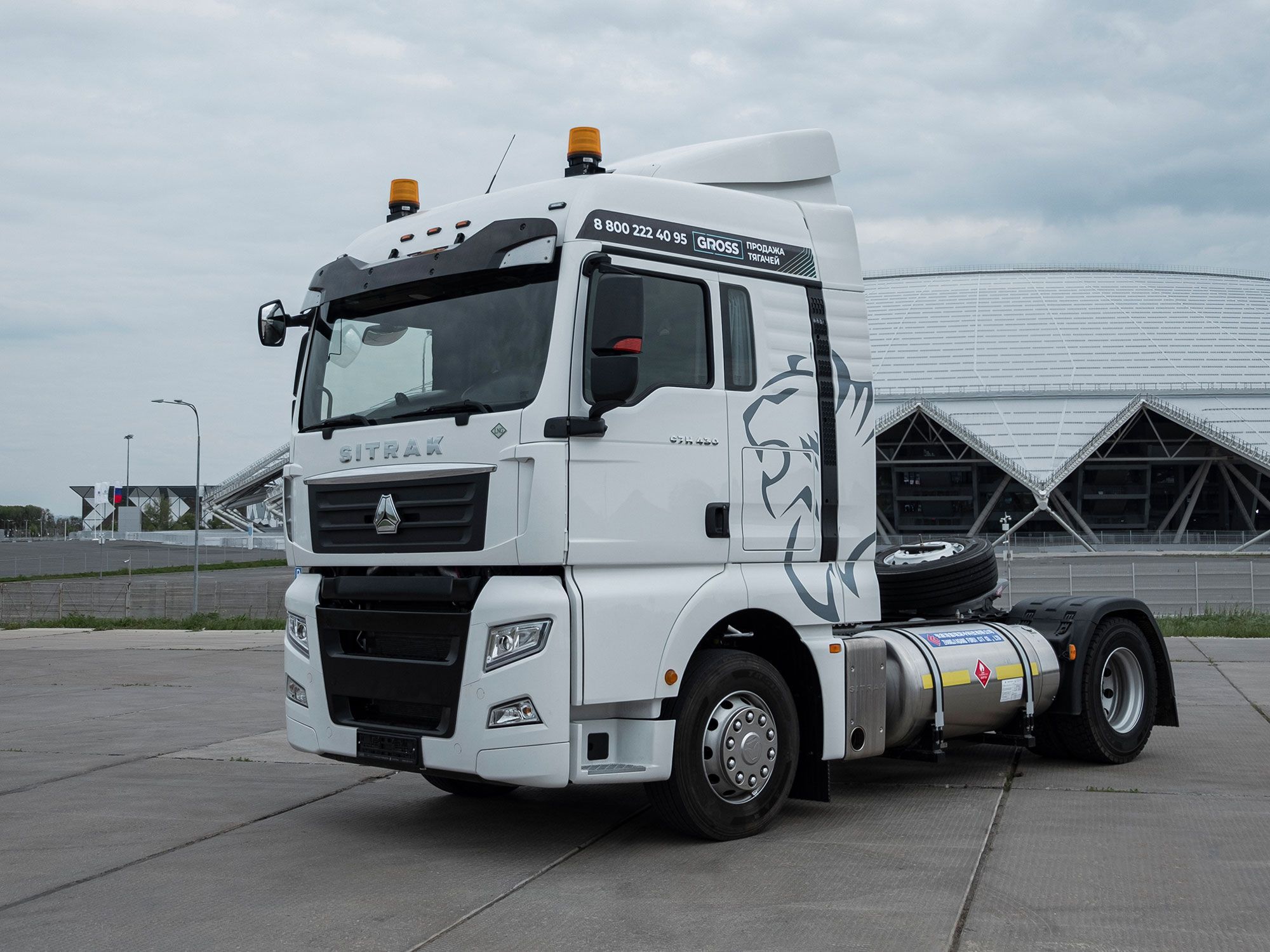 • Тягач в комплектации с двигателем мощностью 430 л.с., механической коробкой передач с ретардером, колесной базой 3900 мм и высотой седла 1150 мм. Работает на сжиженном природном газе СПГ (LNG);