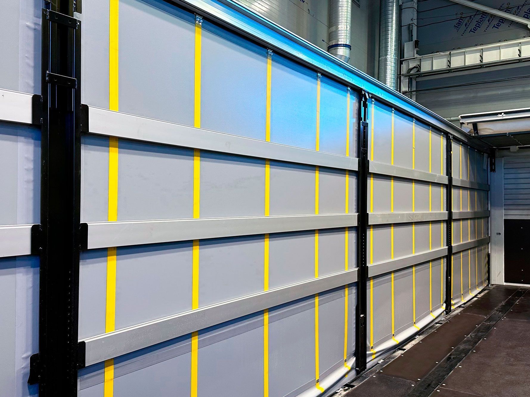 Тент усилен разборными алюминиевыми поперечинами. При необходимости можно раздельно раскрыть бортовую штору и крышу, верхнюю часть тента. Полог фиксируется к сдвижному механизму специальными ремешками и складывается гармошкой.